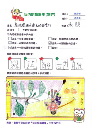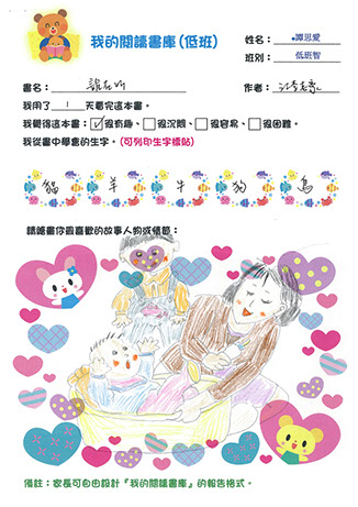 「親子閱讀獎勵計劃」是鼓勵家長多陪伴孩子閱讀圖書,從小培養愛閱讀的習慣。為增進孩子對所閱書本的理解和記憶,懇請家長在閱讀後選擇最喜愛的書,與孩子一同完成詳細的閱讀報告,在撰寫的過程中,讓孩子從中訓練聽、講、讀、寫的語文根基。感謝家長積極參與閱讀計劃,並用心地設計別具一格的《我的閱讀書庫-閱讀報告》,為孩子建立愛書人的好榜樣!