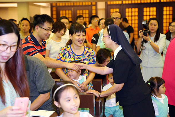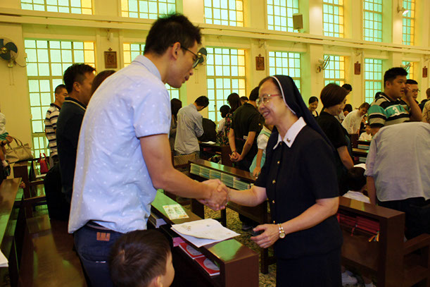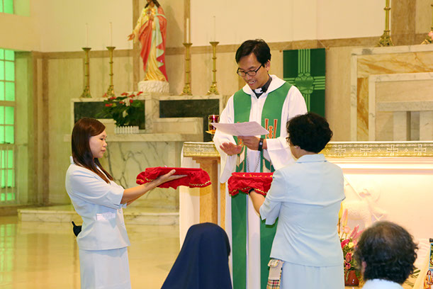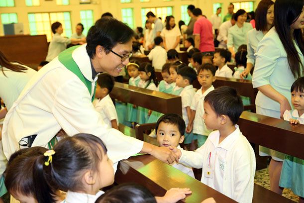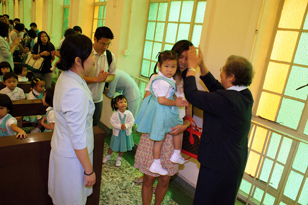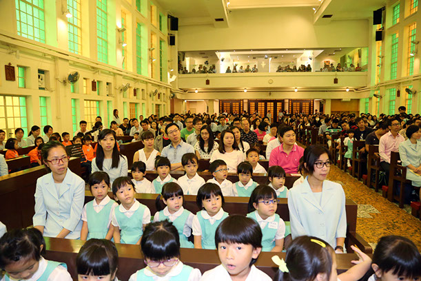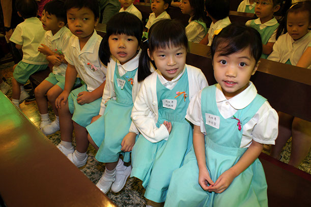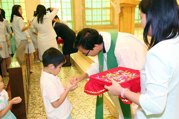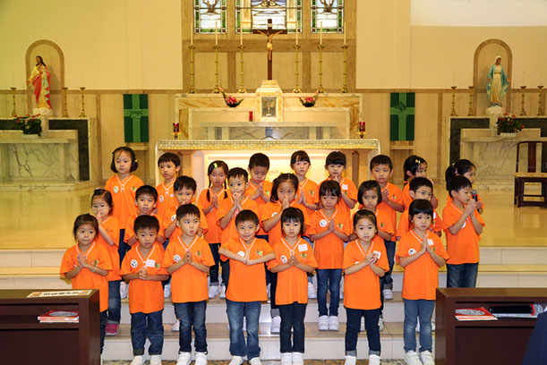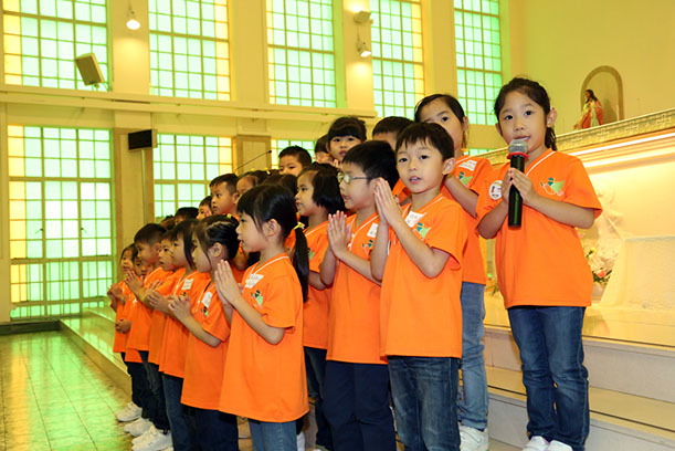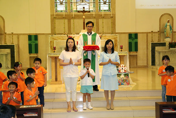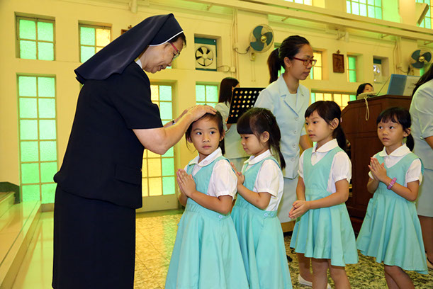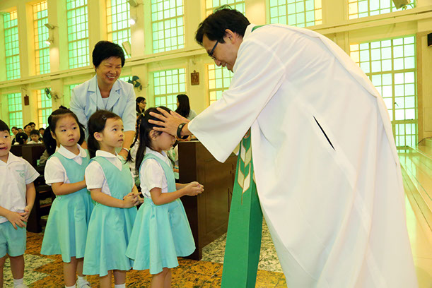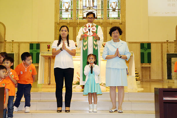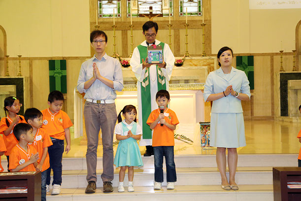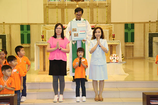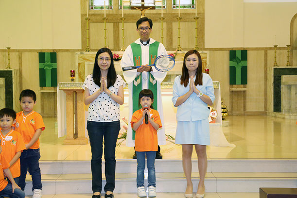 2015年10月3日(星期六) 為學校的開學禮儀暨基督小幼苗承諾禮,本年度主題為「分享愛 愛分享」。我們很榮幸邀請了北角聖猶達堂麥英健神父主持禮儀,麥神父以「電筒」帶出了一個訊息–天主的國正屬於心靈充滿愛的兒童,父母應教導孩子保存這顆懂得「分享」的心,父母亦應自己以身作則,讓孩子學習愛與分享,共同為社會而作出貢獻。接著,麥神父也為基督小幼苗舉行承諾禮,提醒隊員在團體中要彼此服務。其後,麥神父、校監區綺雯修女及校長甘麗貞修女為全體出席學生及家長覆手祝福,讓大家帶著主賜的平安與喜樂迎接新學年。