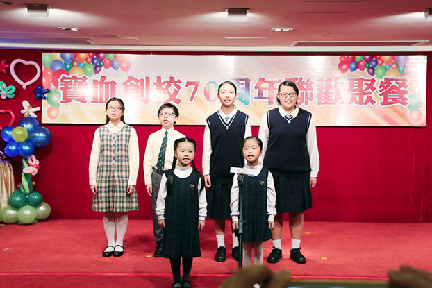 「寶血創校70周年聯歡聚餐」於2015年12月5日在名都酒樓舉行,當晚邀請寶血女修會總會長鄺麗娟修女進行既溫馨又隆重的薪火相傳儀式,鄺會長將一棵小幼苗傳到中、小、幼三位校長手中,喻意師生傳授,將寶血的精神傳承下去,幼稚園學生更用舞蹈演繹小幼苗的成長過程。接著眾主禮嘉賓更為我們主持喜氣洋洋的祝壽儀式,在蛋糕放上蜜桃,喻意寶血在過去70年來用心培育無數學生,桃李滿天下。
