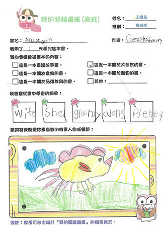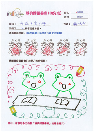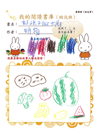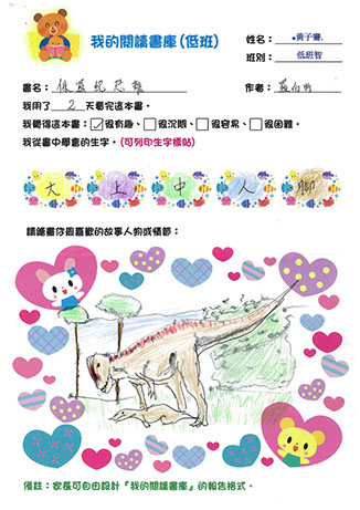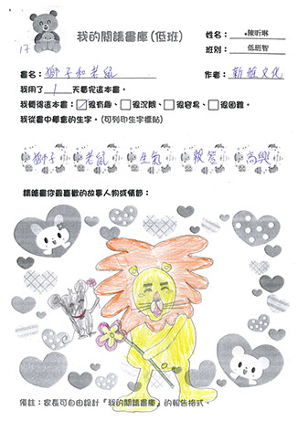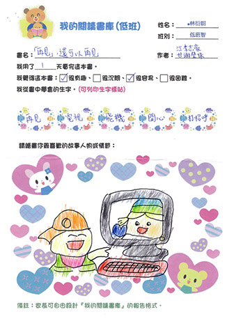 「親子閱讀獎勵計劃」是鼓勵家長多陪伴孩子閱讀圖書,從小培養愛閱讀的習慣。為增進孩子對所閱書本的理解和記憶,懇請家長在閱讀後選擇最喜愛的書,與孩子一同完成詳細的閱讀報告,在撰寫的過程中,讓孩子從中訓練聽、講、讀、寫的語文根基。感謝家長積極參與閱讀計劃,並用心地設計別具一格的《我的閱讀書庫-閱讀報告》,為孩子建立愛書人的好榜樣!